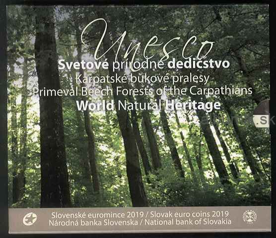 SR, 2019;  set slovenských mincí 1 cent – 2 eurá: UNESCO- Karpatské bukové pralesy so žetónom