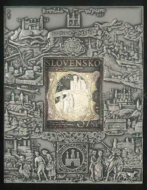 SR 2007, hárček H 402, Bratislavský hrad, vyrazené ako plaketa, Ag 925/ 1000, 93 gr, limitovaná razba v luxusnej drevenej etui; Papierový prebal (ušpinený) s vlepeným hárčekom 420.