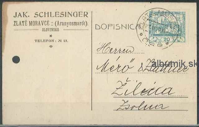 ČSR I 1920, ZLATÉ MORAVCE, firemný lístok, frankovaný Hradčanmi, diera po zaraďovači