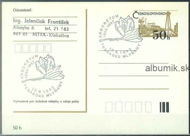 ČSR II 1992, poštový lístok s 2 Prp Tesárske Mlyňany: Arborétum