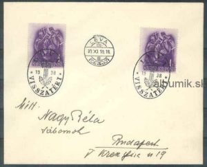 Maďarský zábor 1938, Levice „B“, denná maďarská pečiatka + 2x pečiatka VISSZATÉRT na poštou prešlej obálke do Bp